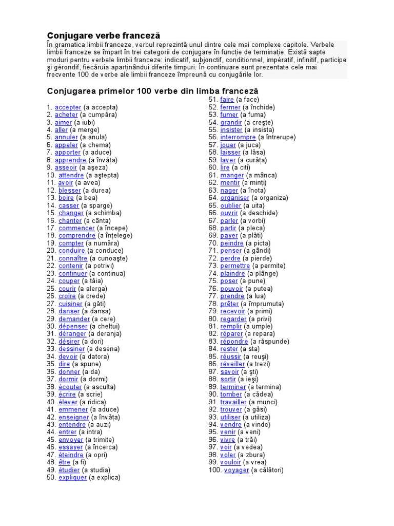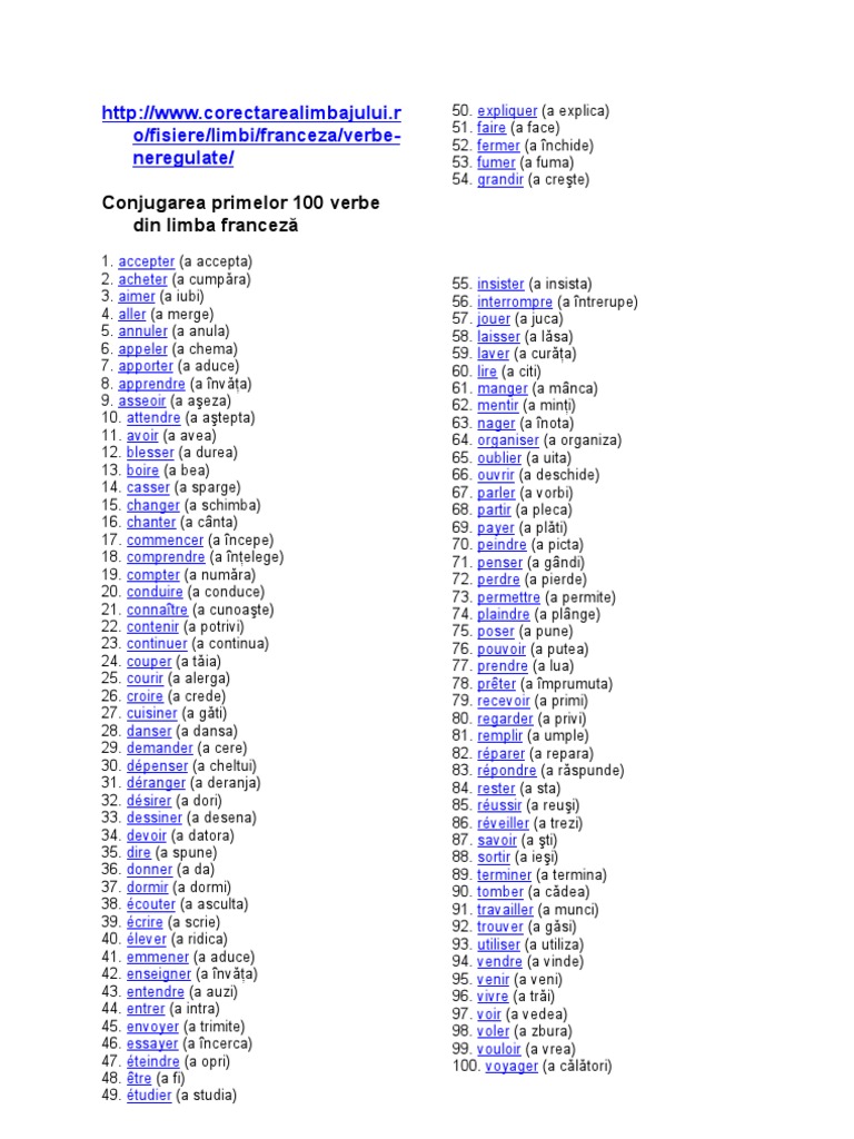 Conjugarea Primelor 100 Verbe Din Limba Franceză