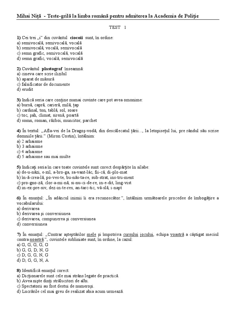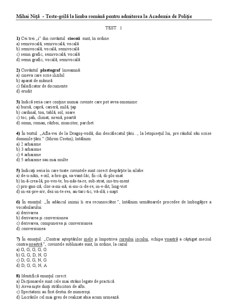 Teste Grila La Limba Romana Pentru Academia De Politie Mihai